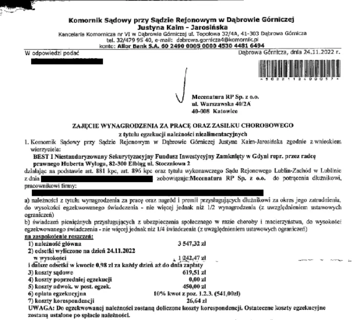 - Postanowienie sądu o zabezpieczeniu roszczenia z dnia 20 marca 2023 roku – odsetki ustawowe 6% rocznie.